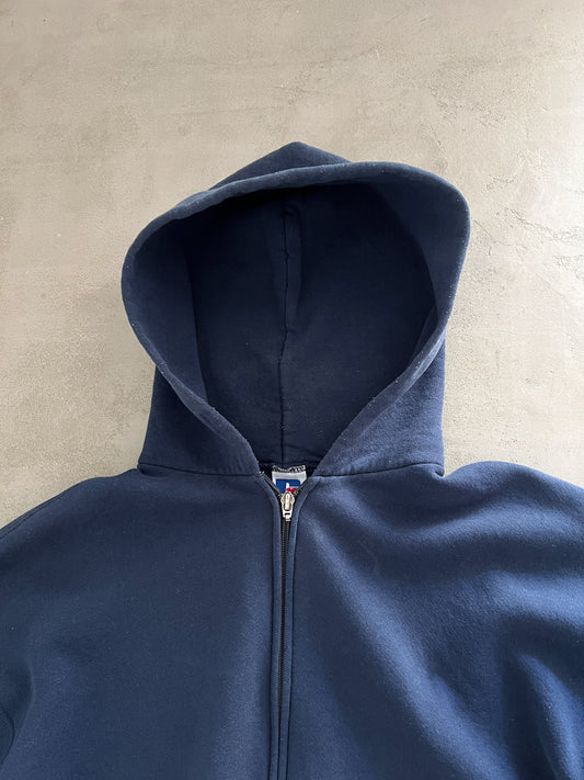 NAVY RUSSELL ATHLETIC ZIP UP HOODIE - 1990S - L